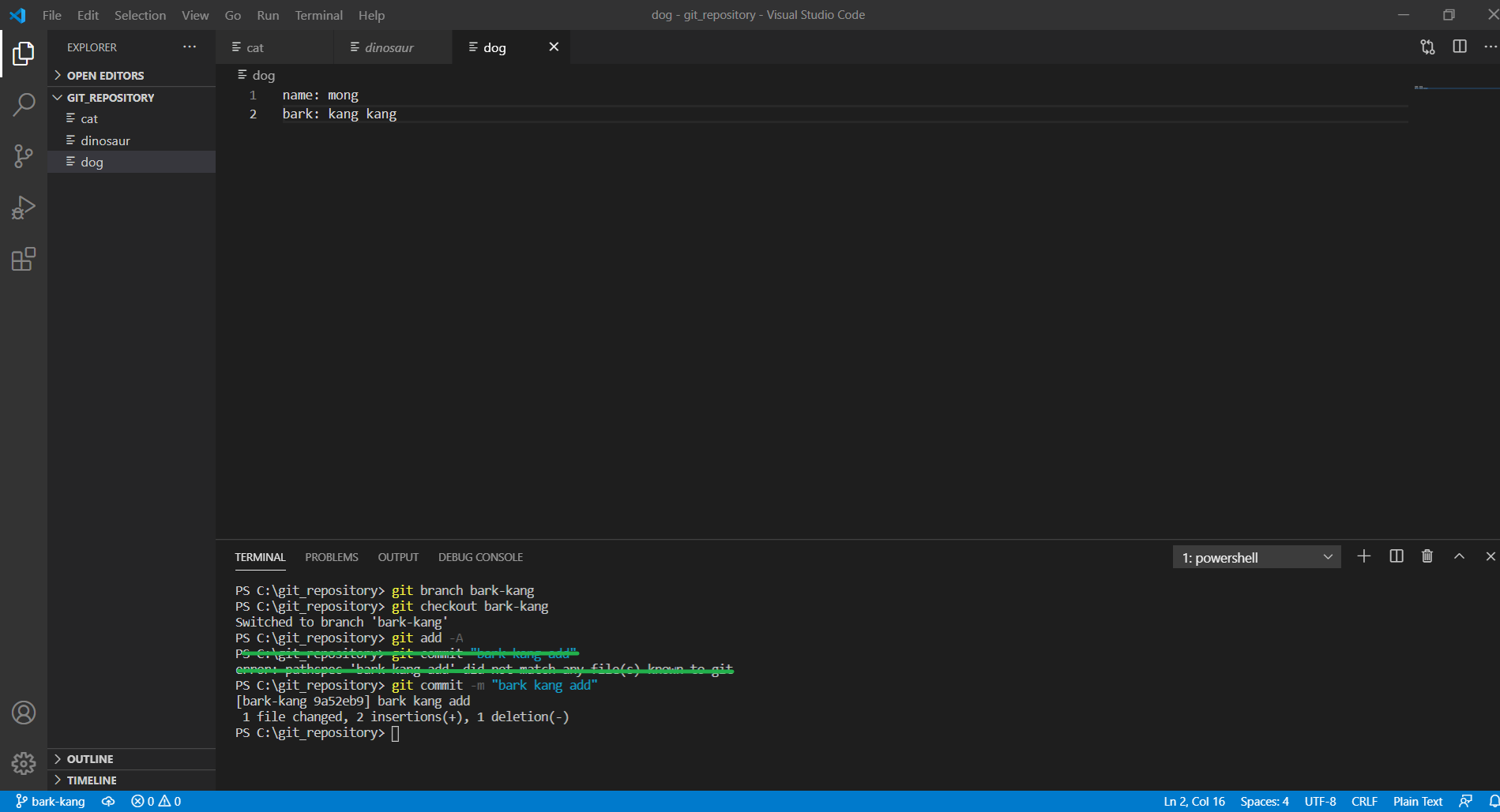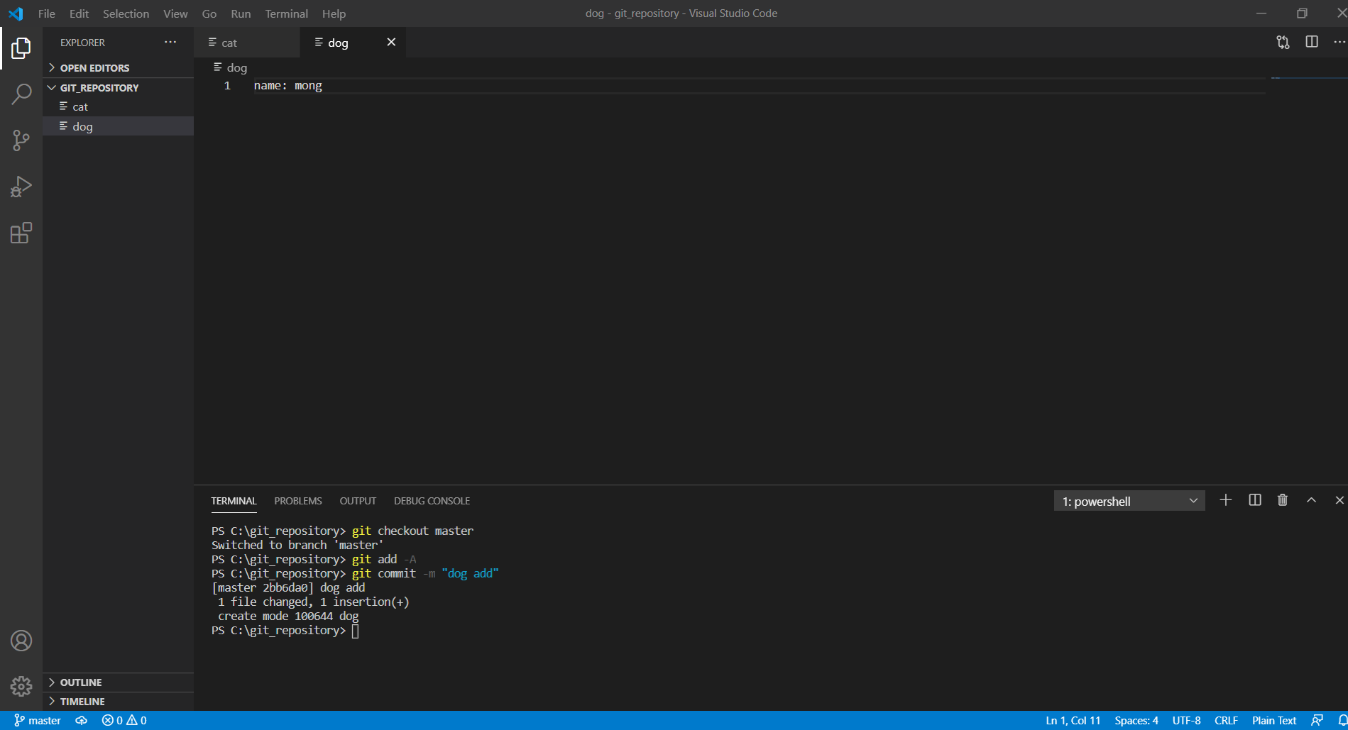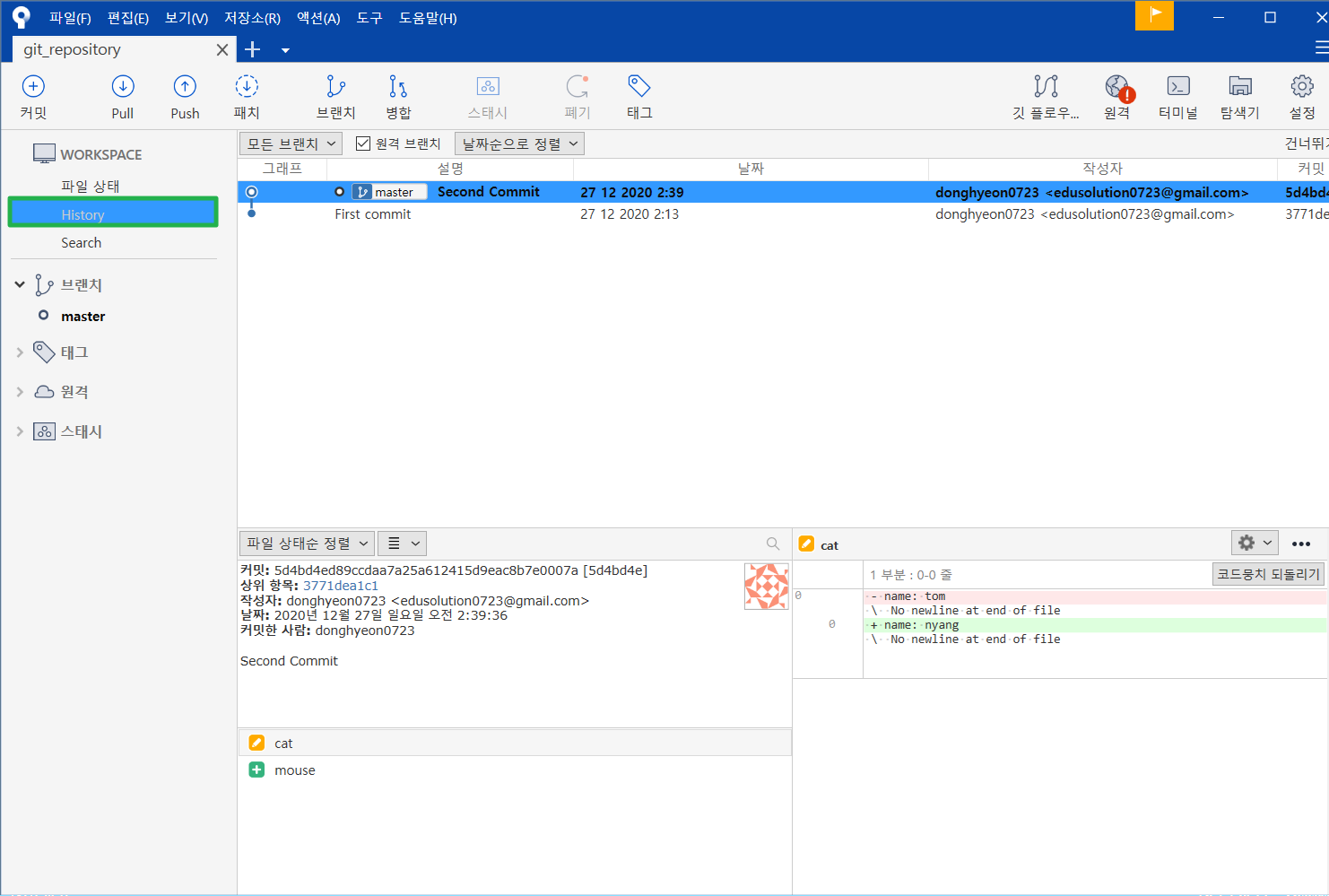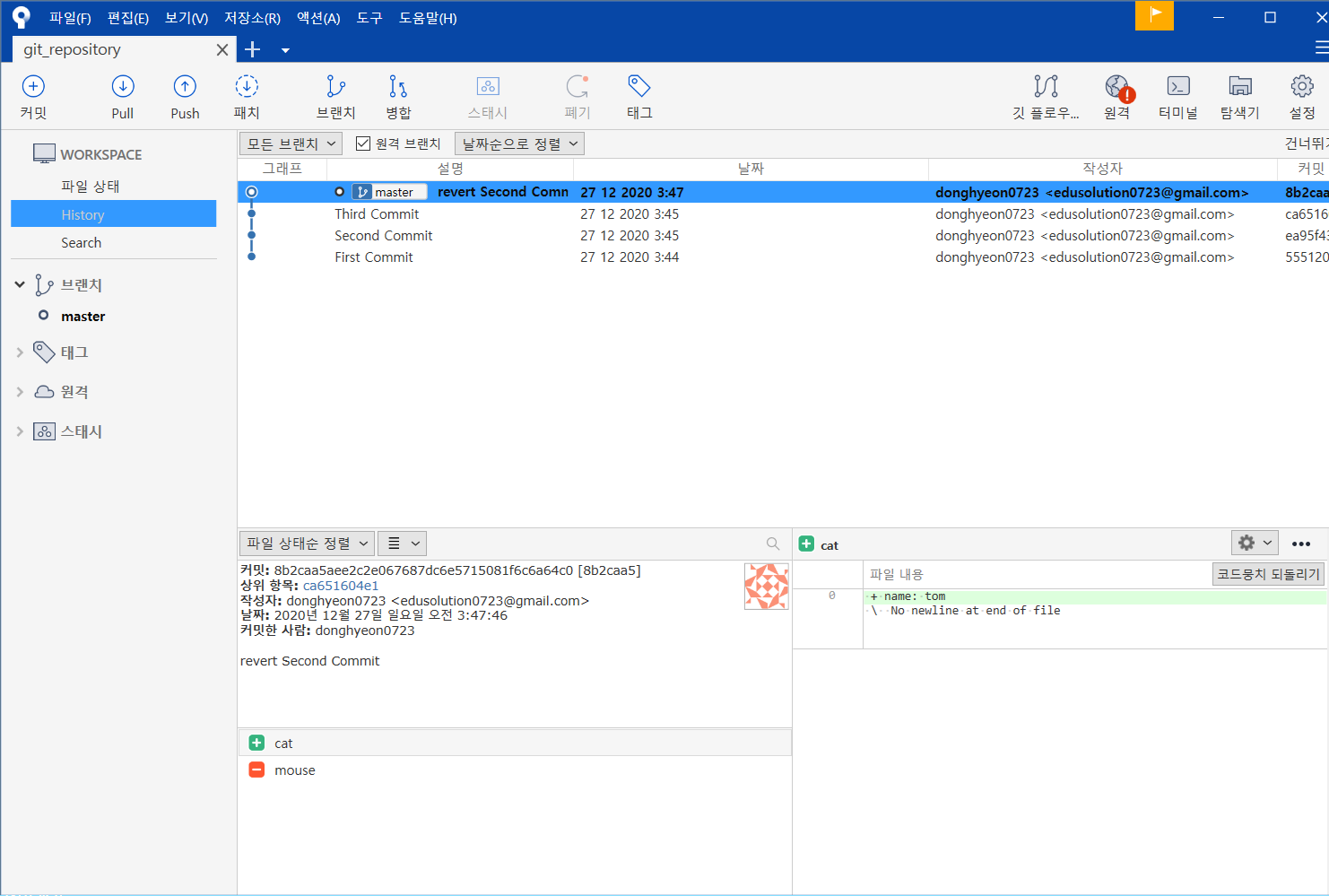 위에서 배운 방법대로 cat을 지우고 커밋해보자