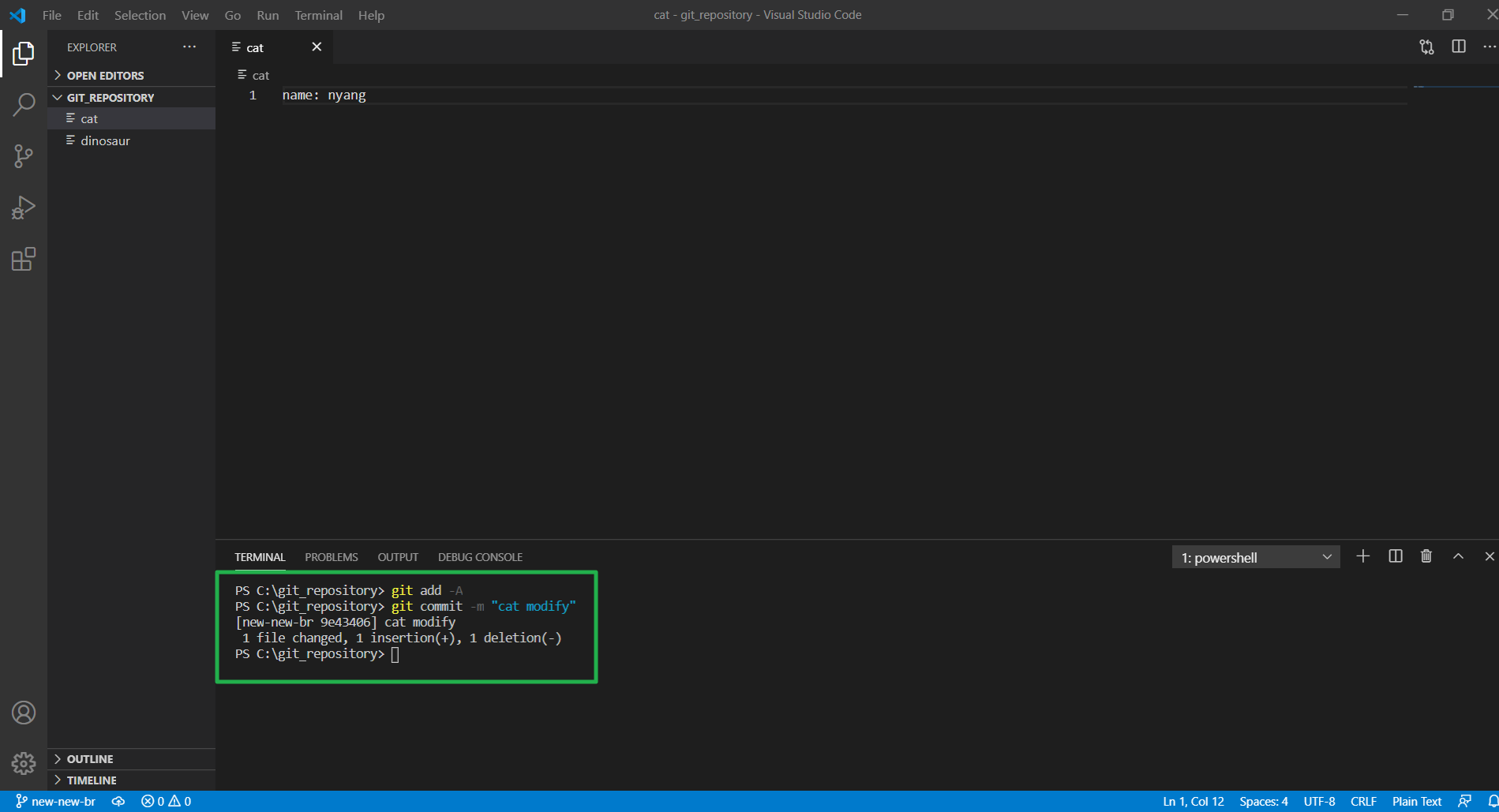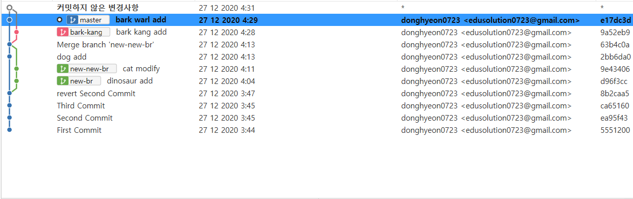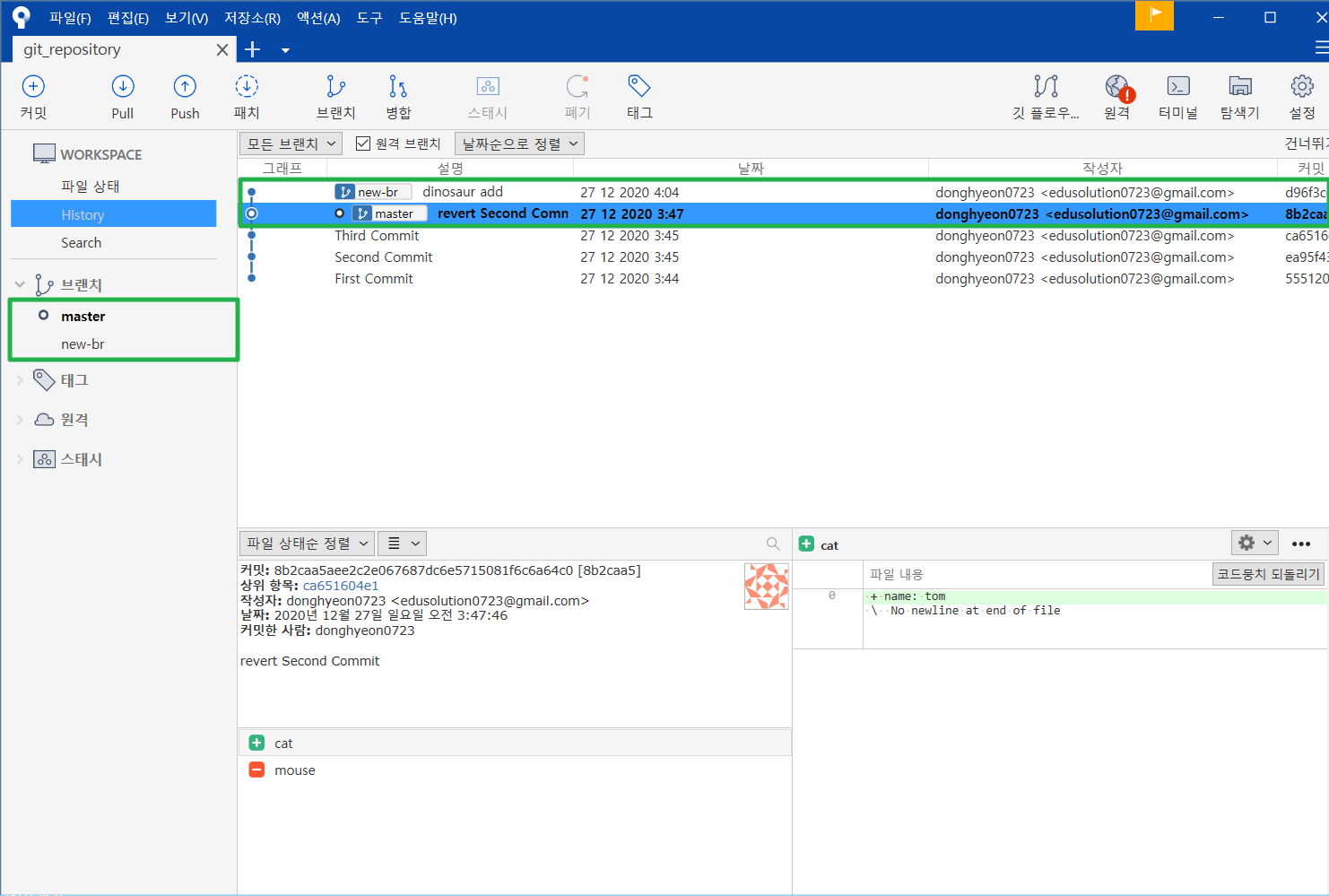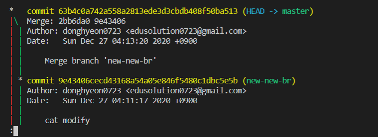 master와 new-new-br을 merge(병합) 했다. 마스터 브랜치에서 변화가 없었던 cat은 new-new-br 버전으로 덮어 썼고