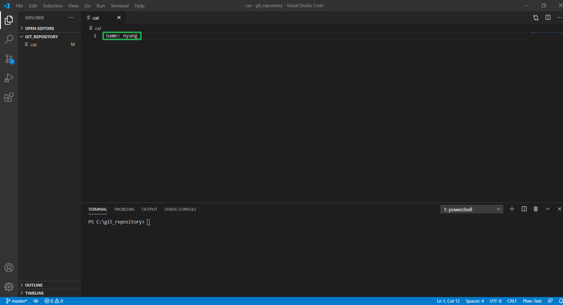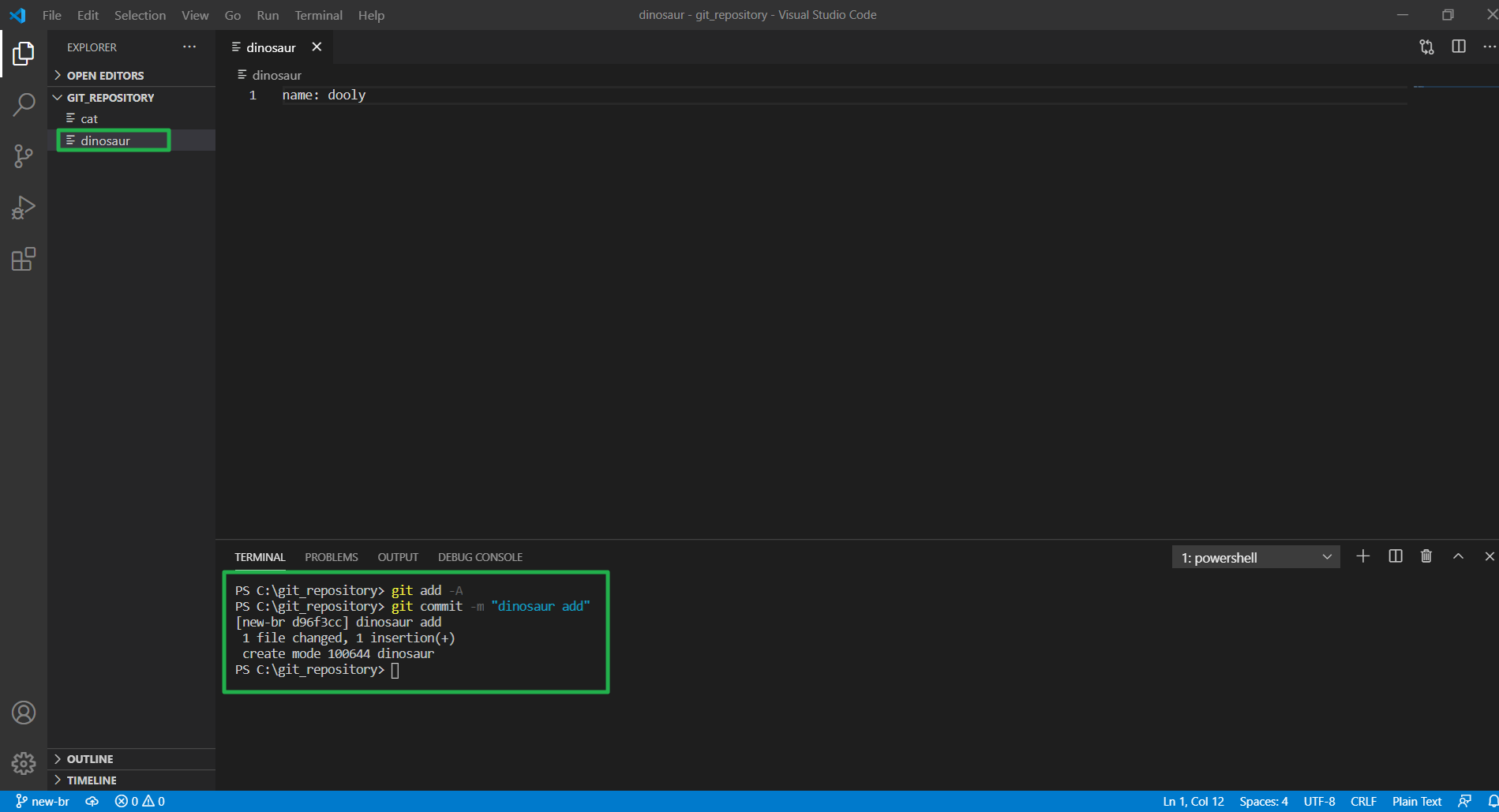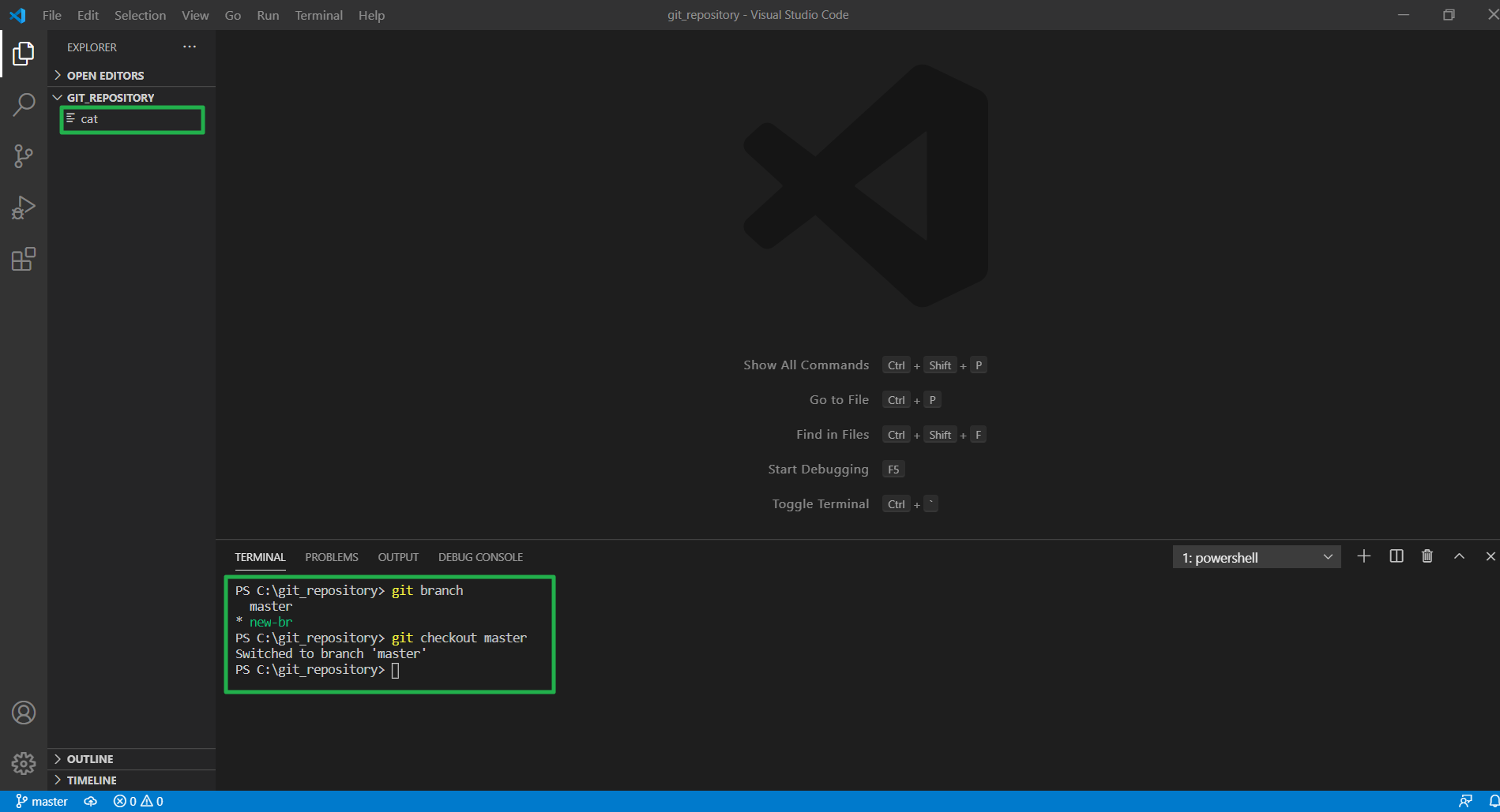 master와 new-new-br을 merge(병합) 했다. 마스터 브랜치에서 변화가 없었던 cat은 new-new-br 버전으로 덮어 썼고