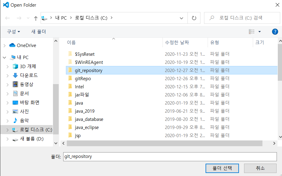 이제 이 폴더를 깃 저장소로 사용할 것입니다.