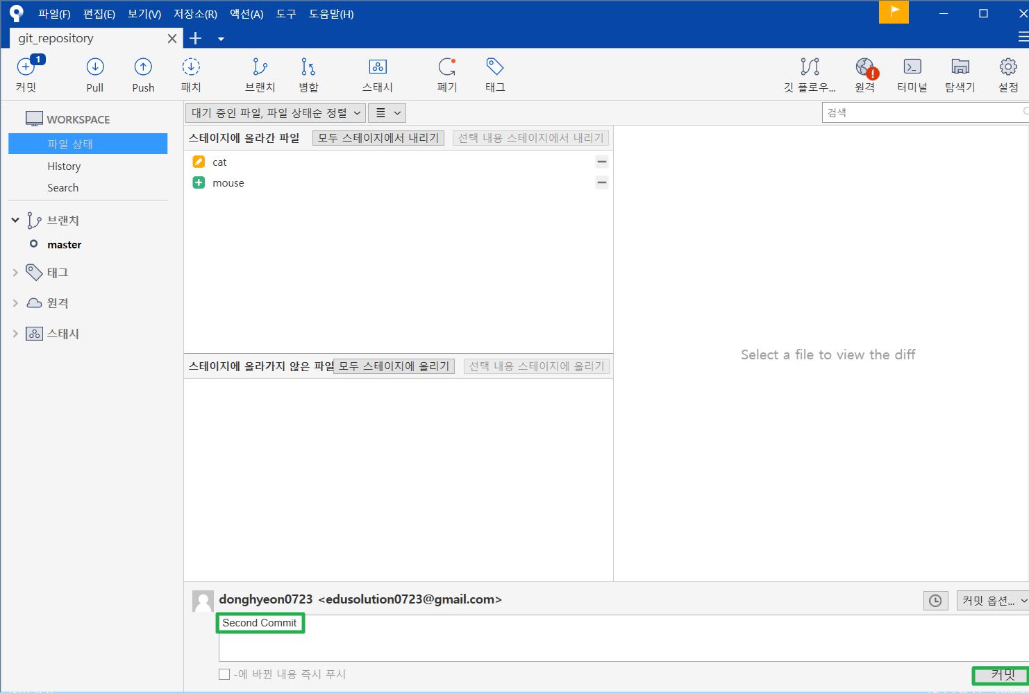 스테이징에 파일을 올리고 커밋해보자!
