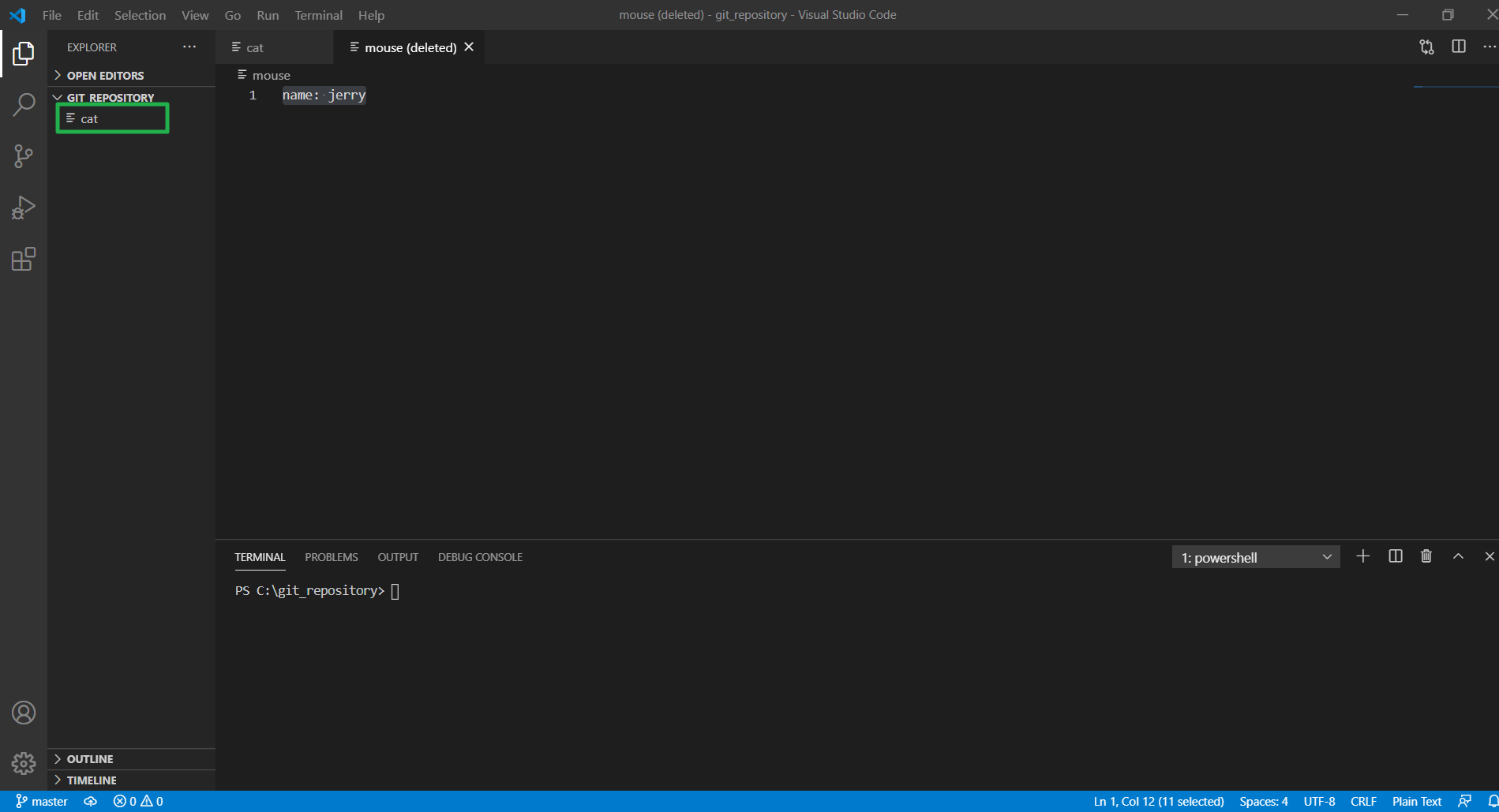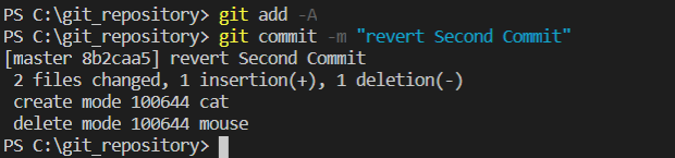 워킹 디렉터리를 살피면 mouse는 삭제되어있고, cat은 원래대로 되돌아 온 모습을 확인 가능하다.