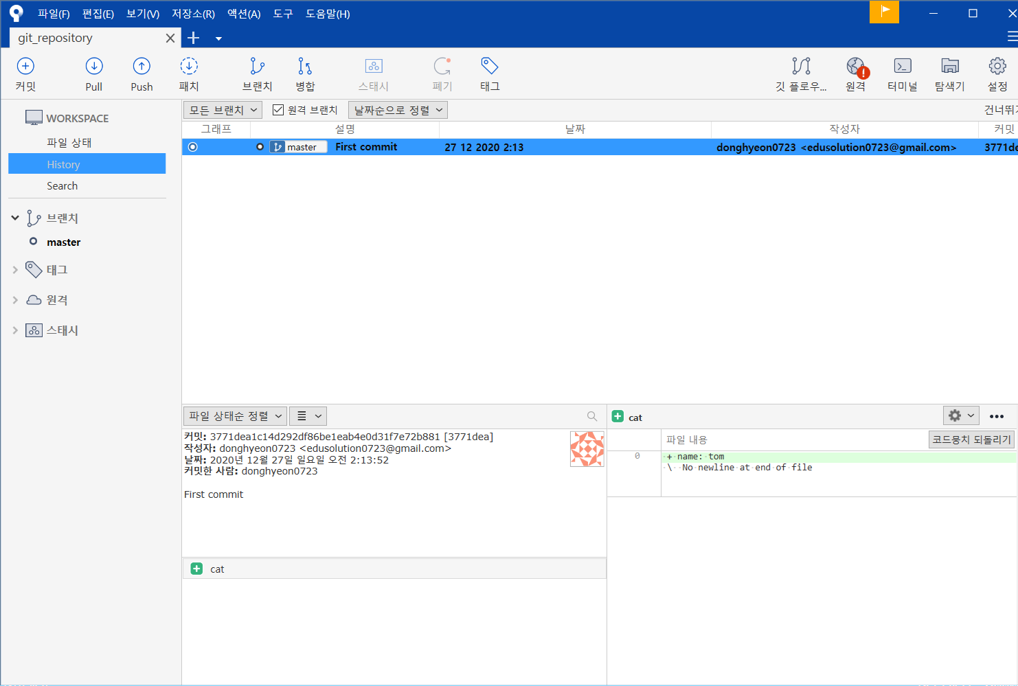 1. 번은 브랜치나 커밋히스토리를 보는 등등, git 시스템의 상태를 보는 곳입니다.