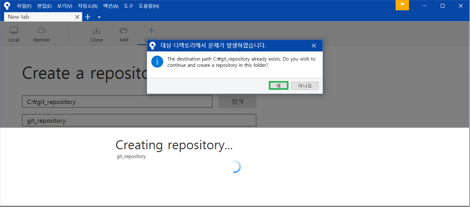 생성된 .git 파일을 지워 git 초기화 설정을 날려버리고 source tree 를 통해 한번 더 해봅시다!