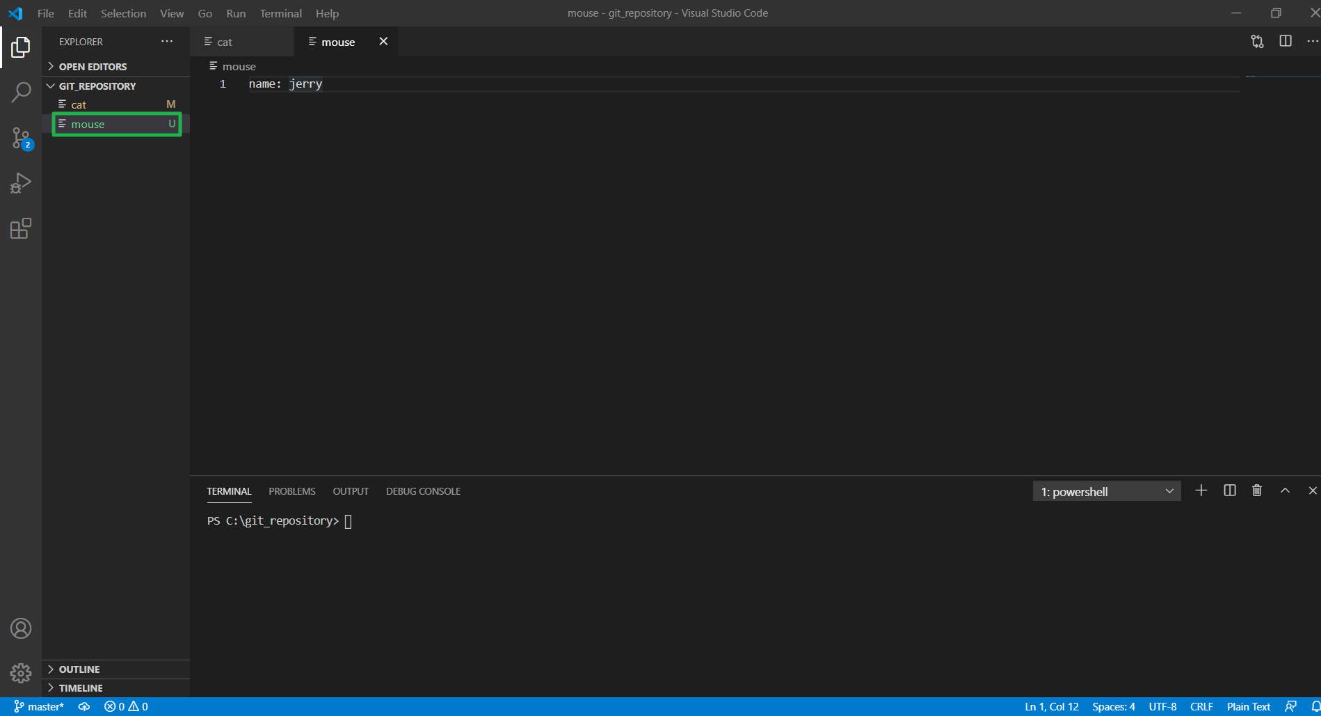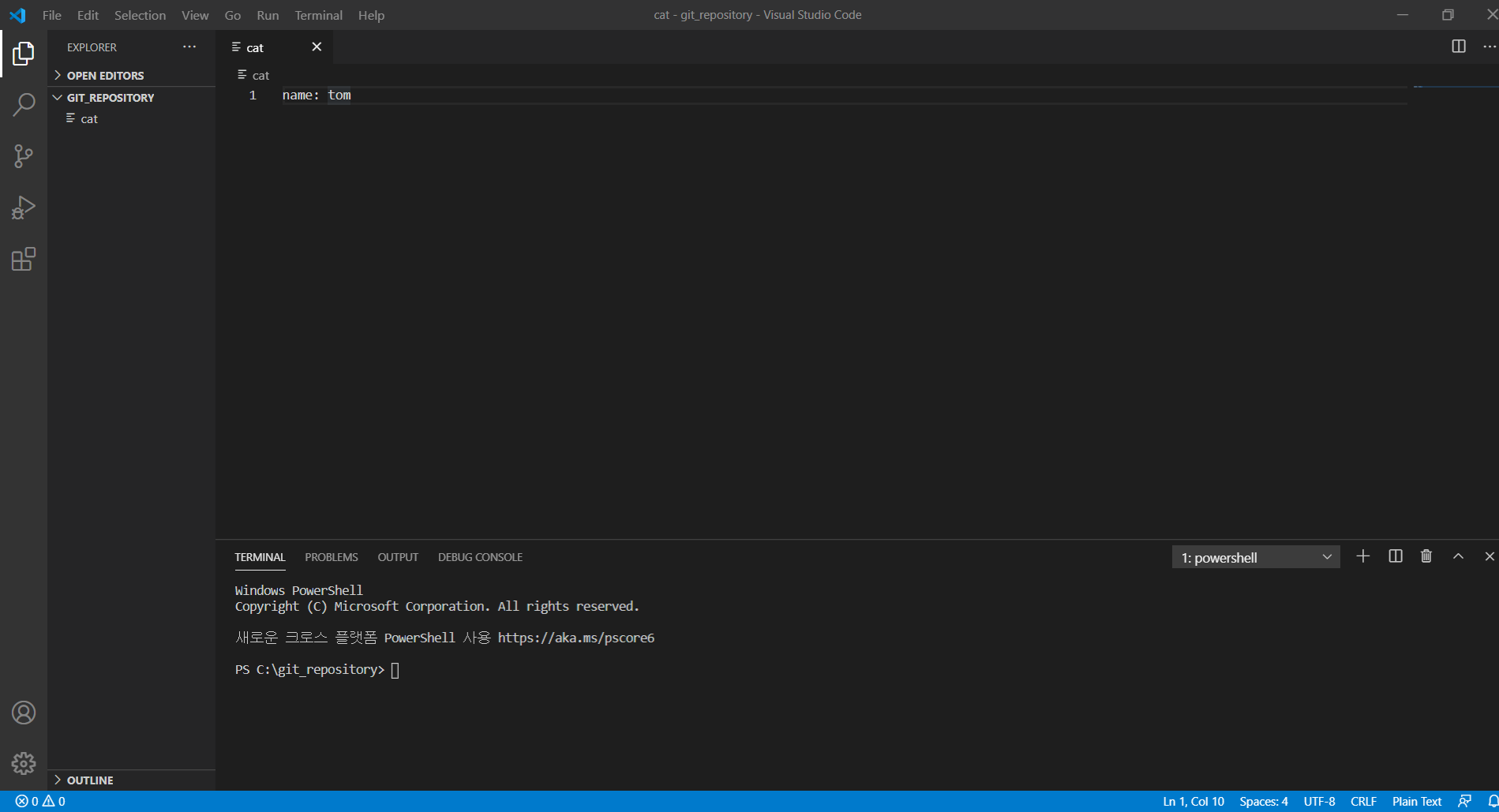 cat 이라는 파일을 만들고 이름을 톰으로 정했습니다.