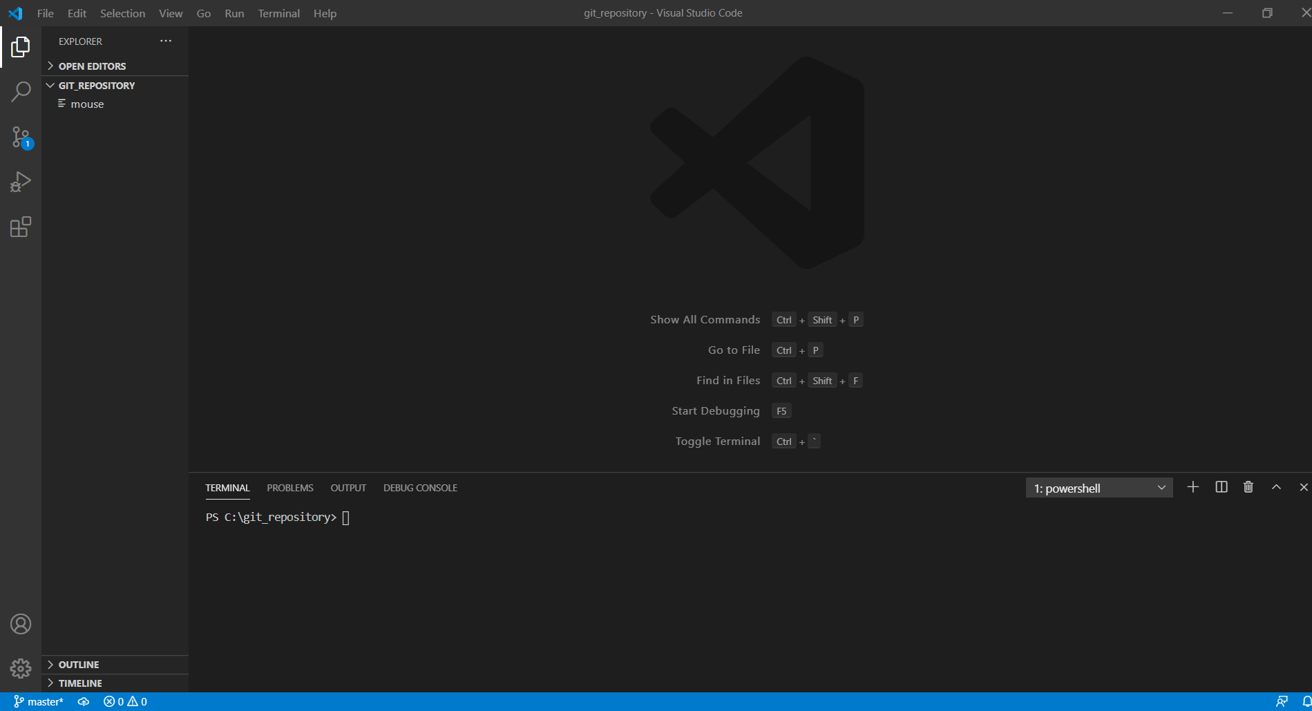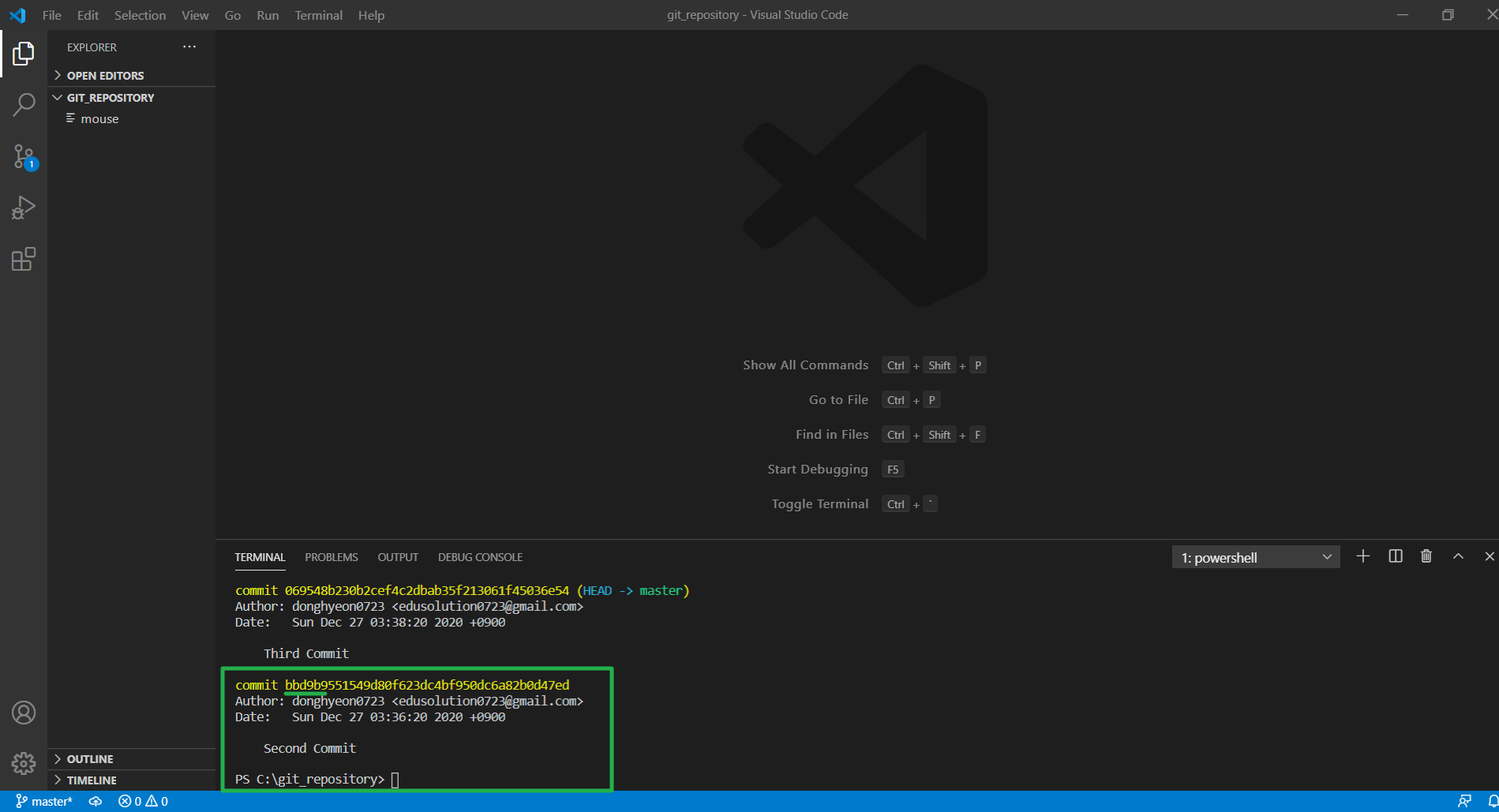CMD 를 통해 git 명령어를 수행할 수도 있지만, Ctrl + ` 을 누르면 명령창이 자동으로 열립니다.