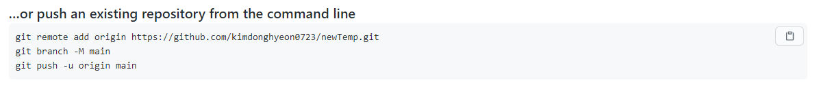 git remote add origin https://github.com/kimdonghyeon0723/newTemp.git => 원격저장소인 https.../newTemp.git을 origin 이라는 이름의 원격저장소로 추가하겠다는 말.