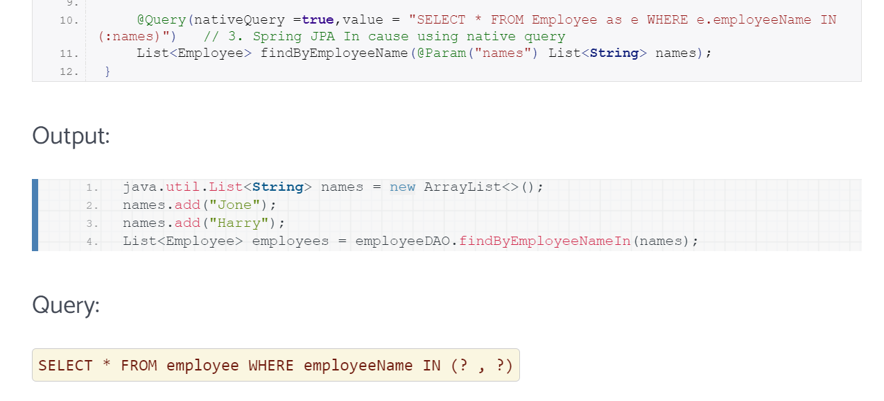 Here is article of Spring JPA query IN clause example and Spring data JPA IN and NOT IN query with example, dyanic IN and NOT IN query with spring JPA.
