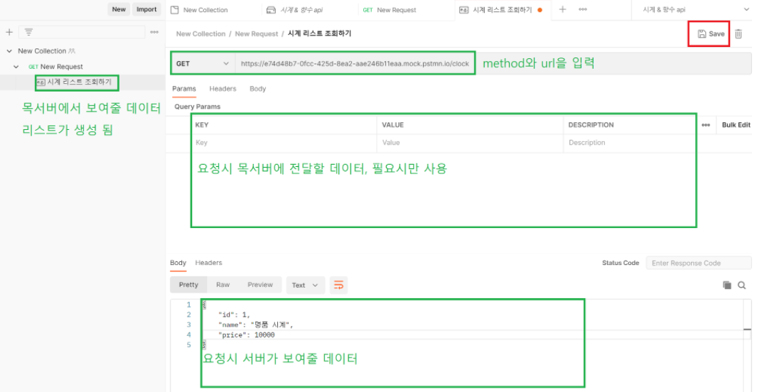 - 좌측에 보이는 리스트는 방금 추가한 목서버 컬렉션과 요청 샘플입니다.