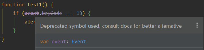 그런데 아직 하나 더 문제가 남아있습니다. keyCode 를 사용하지 말라는 경고 문구입니다.