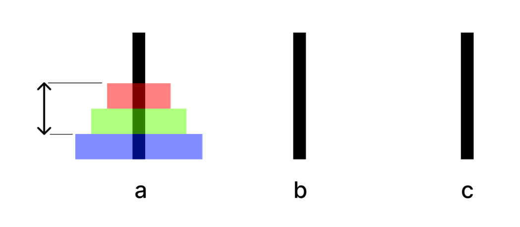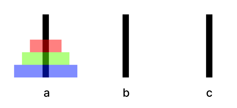 가장 큰 3번째 원판은 위 2개를 b로 옮기는 동안 전혀 움직일 수 없으며, 이 과정을 전부 마친 뒤에야 c로 이동할 기회가 주어집니다.