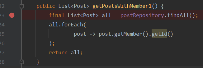 왜일까? 다음과 같이 getPostsWithMember1 메소드 내부에 브레이크 포인트를 걸고 디버깅 해보자.