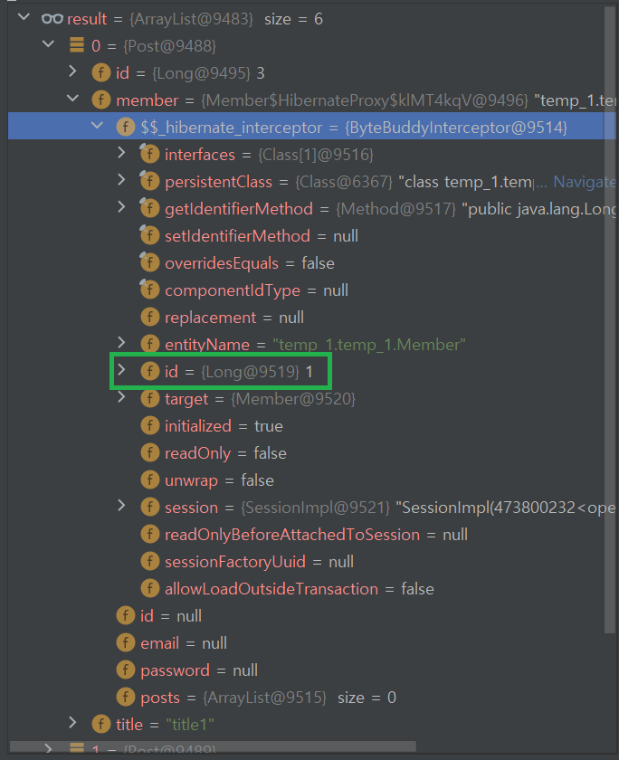 변수 all 을 리턴하는 시점에도 Post 에 Member 필드는 Proxy 객체로 값이 채워지지 않았다.