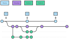 다음 출시 버전을 개발하는 브랜치. 기능 개발을 위한 브랜치들을 병합하기 위해 사용. 즉, 모든 기능이 추가되고 버그가 수정되어 배포 가능한 안정적인 상태라면 develop 브랜치를 master 브랜치에 병합한다. 평소에 이 브랜치를 기반으로 개발을 진행한다.