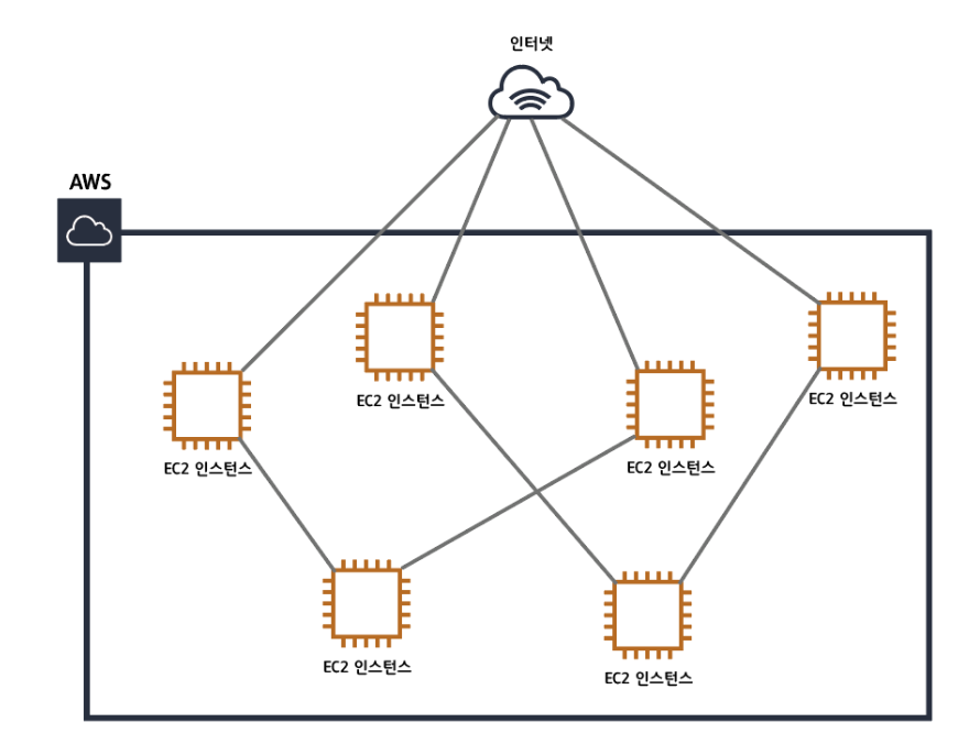 VPC 는 위에서 VPN 과 유사한 역할을 합니다. 만약 VPC 가 없다면 EC2 인스턴스들이 서로 거미줄처럼 연결되고 인터넷과 연결이 됩니다.