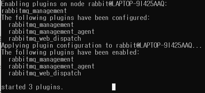 기본 RabbitMQ 가 설치된 경로에서 아래 명령어를 입력한다. 해당 경로는 RabbitMQ log 폴더가 위치한 곳에서 sbin을 찾았다.