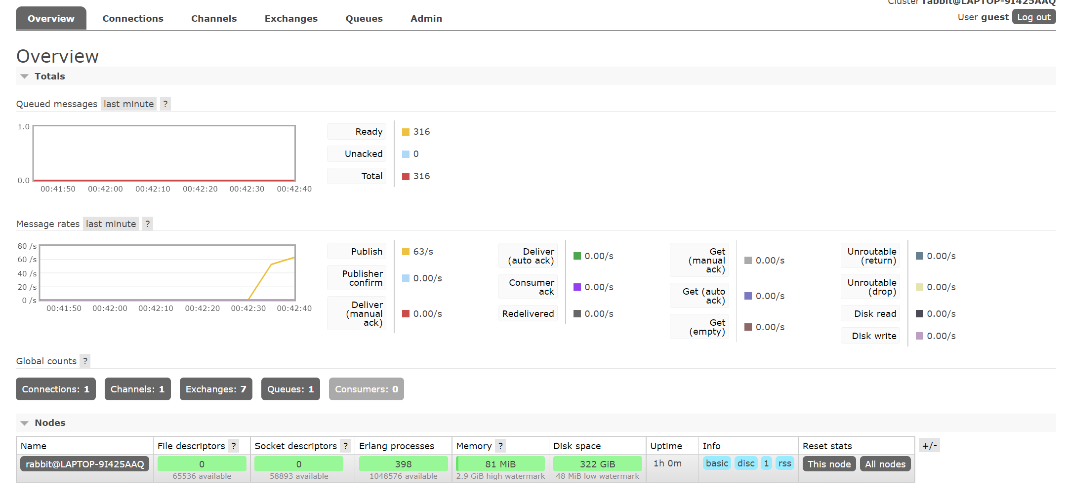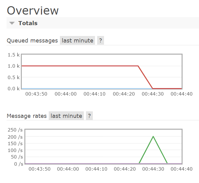 위 코드를 실행시키고 rabbitmq 관리자 콘솔을 보면 메세지가 쌓이는 것을 확인할 수 있다.