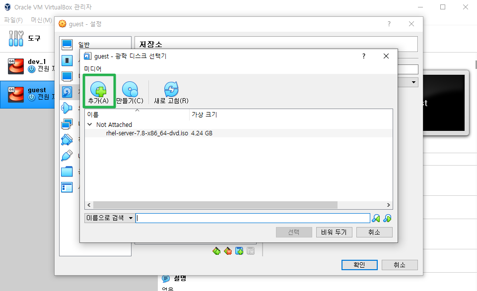 지금 보면 rhel-server-7.8-x86_64-dvd.iso 파일이 이미 보인다. 이것은 이전에 설치를 마쳐놓은 가상 컴퓨터가 있기 때문이다. 여러분은 없을 것이므로 추가 버튼을 눌러 iso 파일을 추가하면 됩니다.