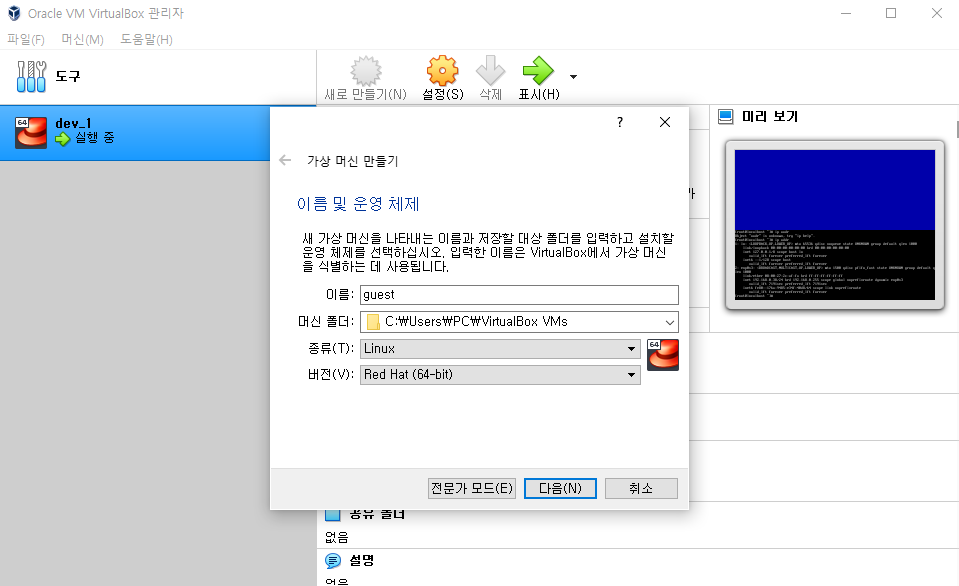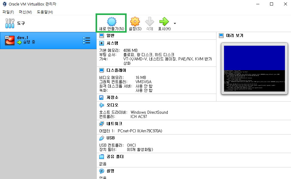 현재 dev_1이 보이는데, 이는 제가 먼저 설치 해놓은 컴퓨터 입니다. 나중에 아시겠지만, 버추얼 박스가 만든 하드디스크(가상하드) 파일은 재사용이 가능합니다(내부 파일 유지)