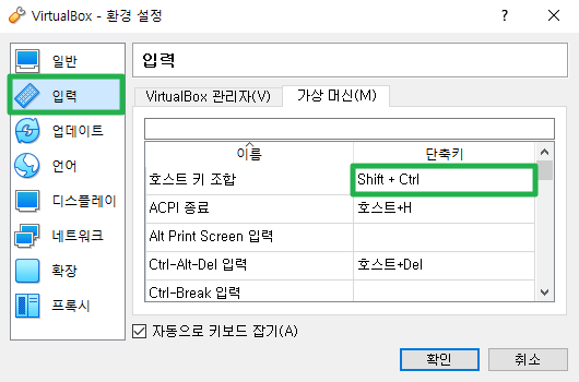 해당 설정은 하지 않아도 된다. 다만, 버추얼박스가 제공하는 명령창에는 마우스를 클릭하면, 마우스가 게스트 컴퓨터 안으로 들어간다. 다시 호스트 컴퓨터로 마우스를 빼내려면 Crtl + Alt + Delete (작업관리창) 를 마우스를 빼내야 하는데 이는 매우 번거로운 작업이다. 따라서 위 설정을 해서 편하게 마우스를 게스트 컴퓨터로 부터 빼내려고 하는 것이다.
