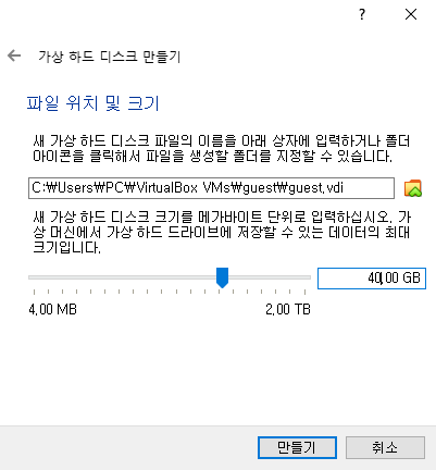동적할당으로 디스크를 만들었을 경우 40GB로 설정한다고 해서 실제 파일 크기가 40GB 만큼 차지하지는 않으므로 40GB로 만들었습니다.