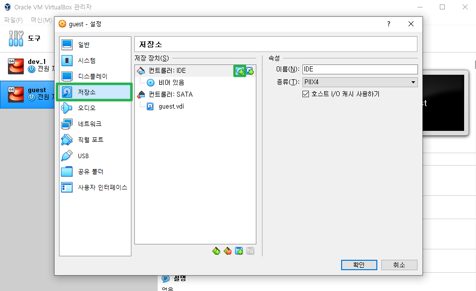 컨트롤러 : IDE 오른쪽에 보면 디스크 그림 두개가 보이는데, 오른쪽 거 말고 왼쪽 것을 누른다.