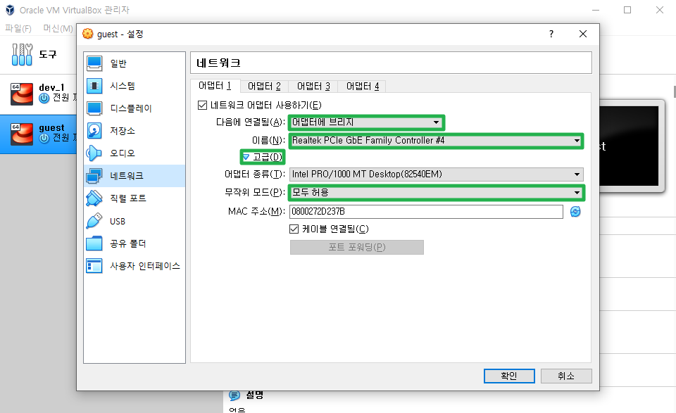 가상 컴퓨터도 컴퓨터이기 때문에 ip를 가진다. 다만, 접근 가능한 게스트컴퓨터의 ip를 얻으려면 위와 같은 설정이 필수 이다. 네트워크 어댑터를 설정하는 것이다. 나중에, 호스트 컴퓨터와 게스트 컴퓨터 간 파일 이동을 쉽게 하려면 해당 설정은 꼭 하는 것이 좋다.
